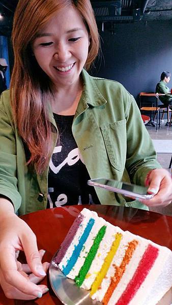 望著來往的人群,享用著視覺效果極佳的彩虹蛋糕