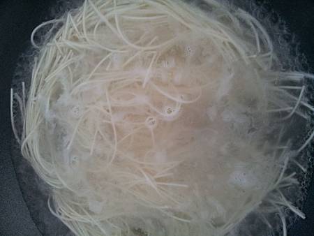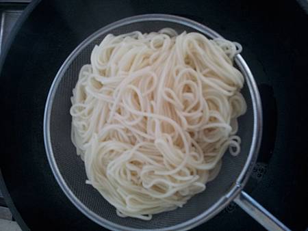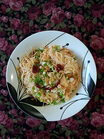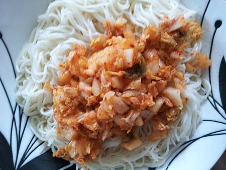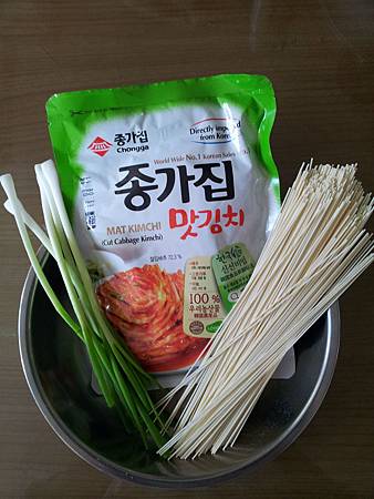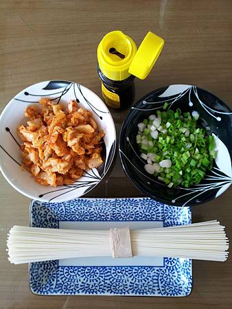 準備好韓國宗家府泡菜、細麵、珠蔥、麻油跟辣拌醬就可以了